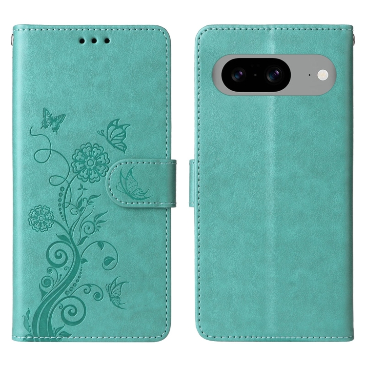 Funda de Cuero Google Pixel 8 con Diseño de Mariposas y Flores en Relieve (Verde)