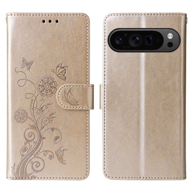 Funda de Cuero Google Pixel 9 Pro XL con Diseño de Mariposas y Flores en Relieve (Dorada)