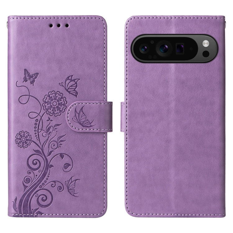 Funda de Cuero para Google Pixel 9 Pro XL con Diseño de Mariposas y Flores en Relieve (Morado)