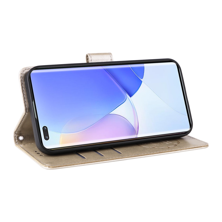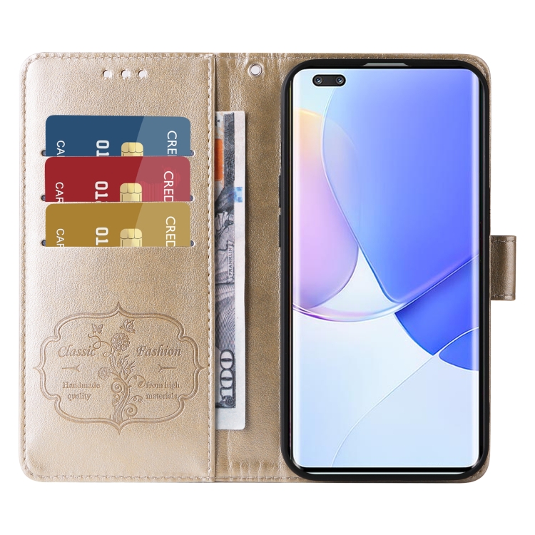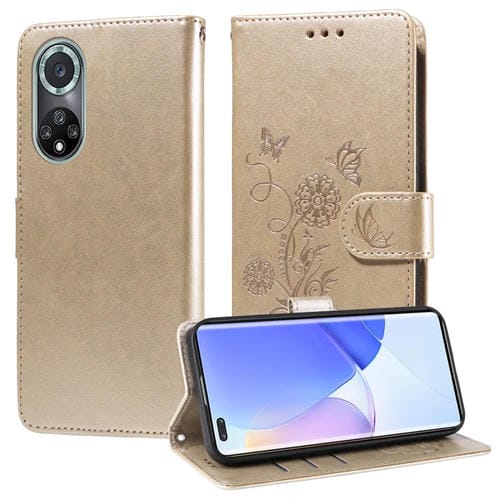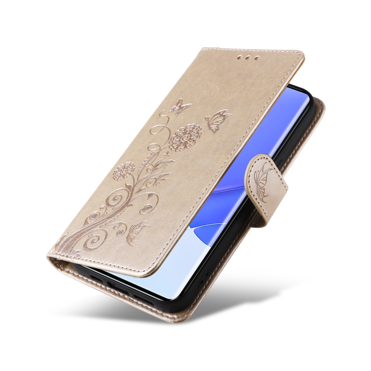 Funda de Cuero con Diseño de Mariposas y Flores en Relieve para Honor 50 Pro y Huawei Nova 9 Pro (Dorada)