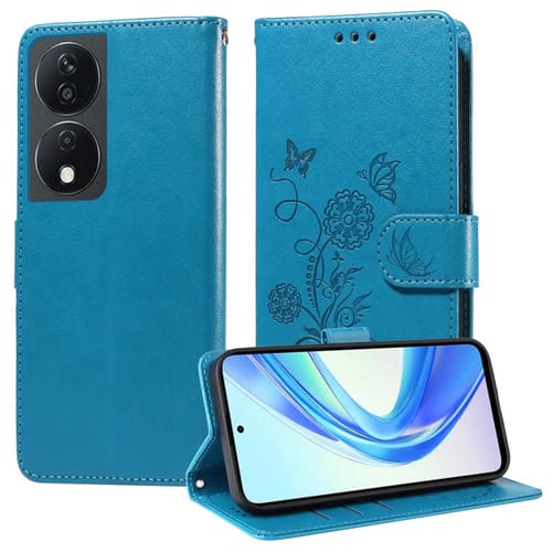Funda de Cuero Honor Play 50 Plus Play 8T Diseño Mariposas Flores en Relieve (Azul)