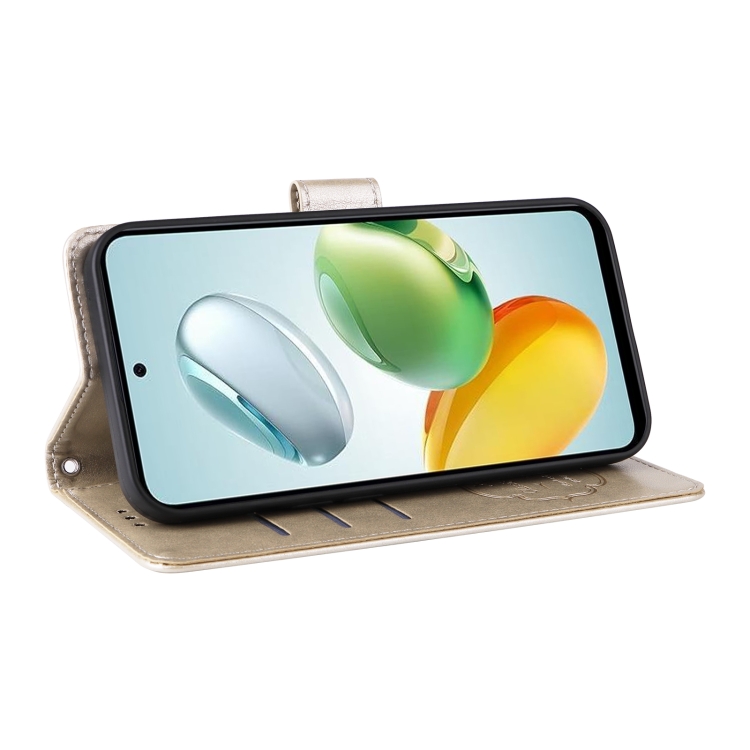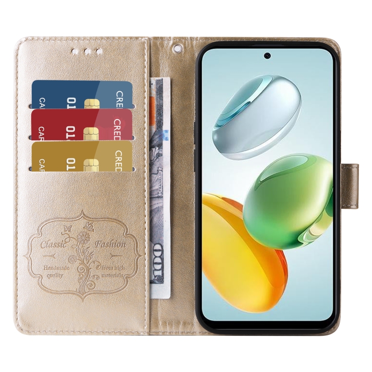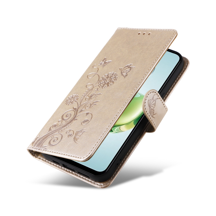 Funda de Cuero para Honor Play 60 Plus con Diseño de Mariposas y Flores en Relieve (Dorada)