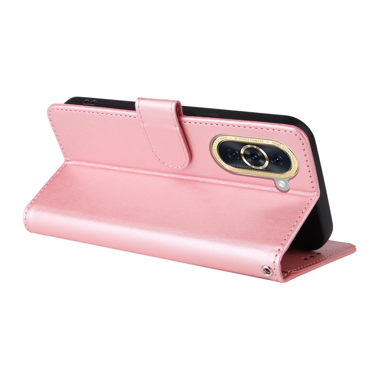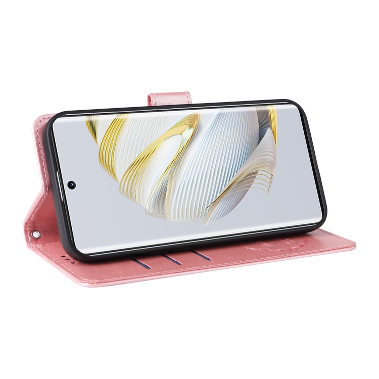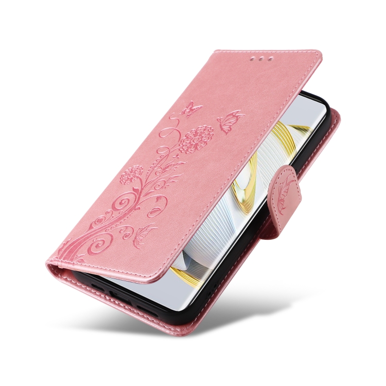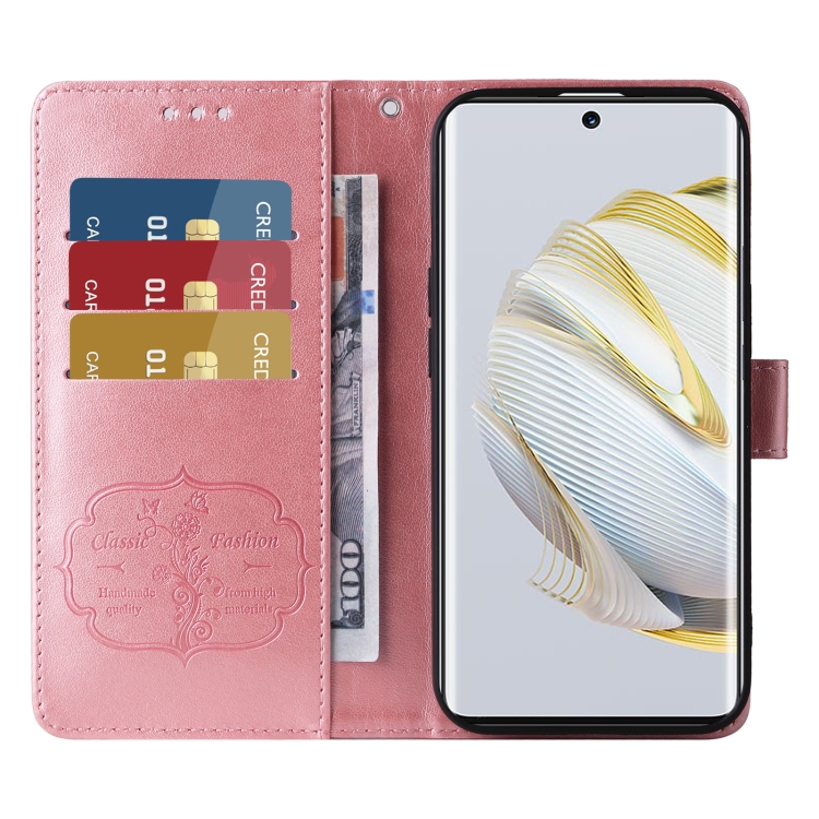 Funda de Cuero para Huawei Nova 10 con Diseño de Mariposas y Flores en Relieve (Oro Rosa)