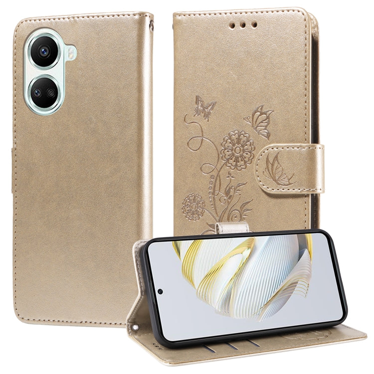 Funda de Cuero Huawei Nova 10 Se con Diseño de Mariposas y Flores en Relieve (Dorada)
