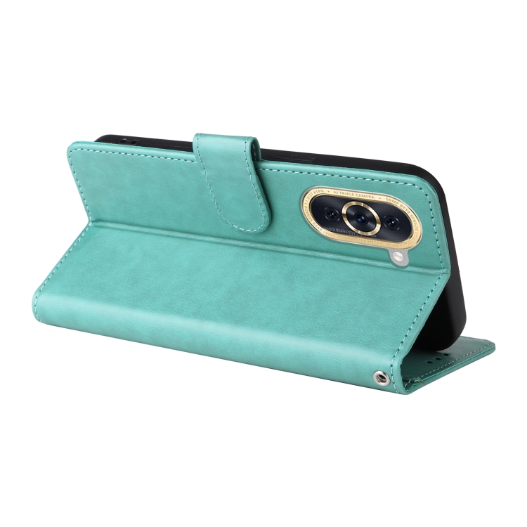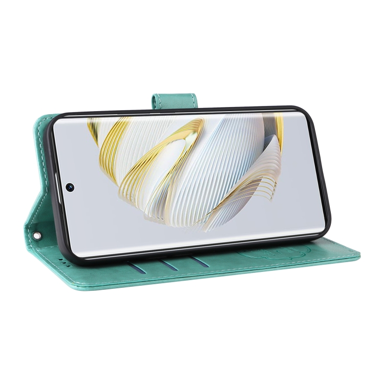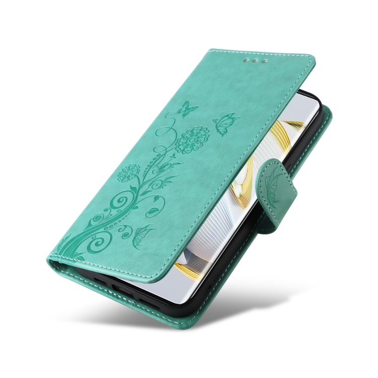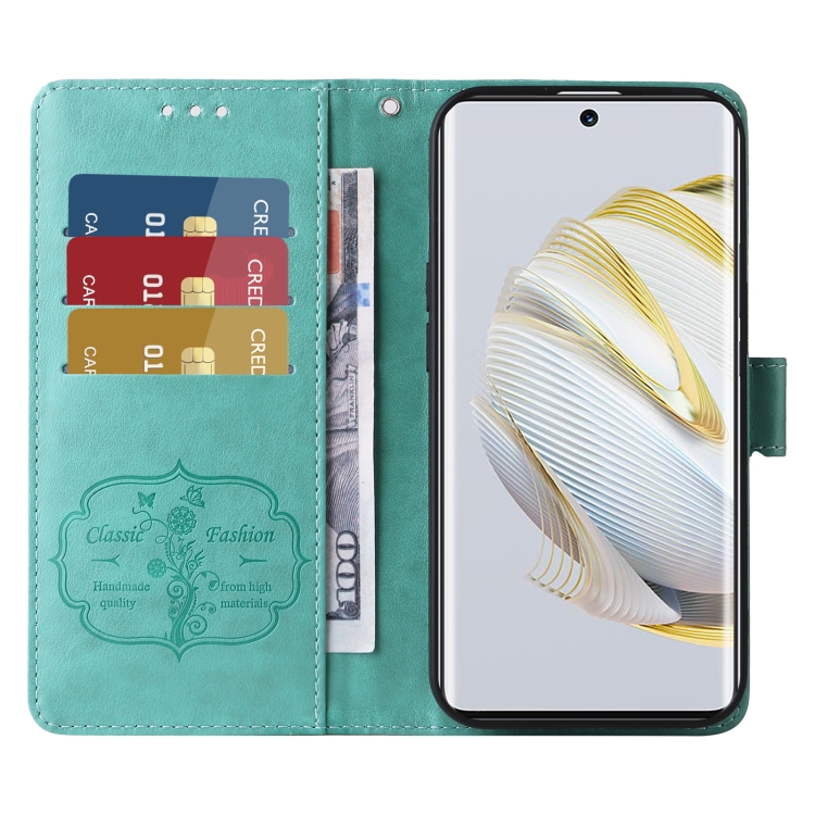 Funda de Cuero Huawei Nova 10 con Diseño de Mariposas y Flores en Relieve (Verde)