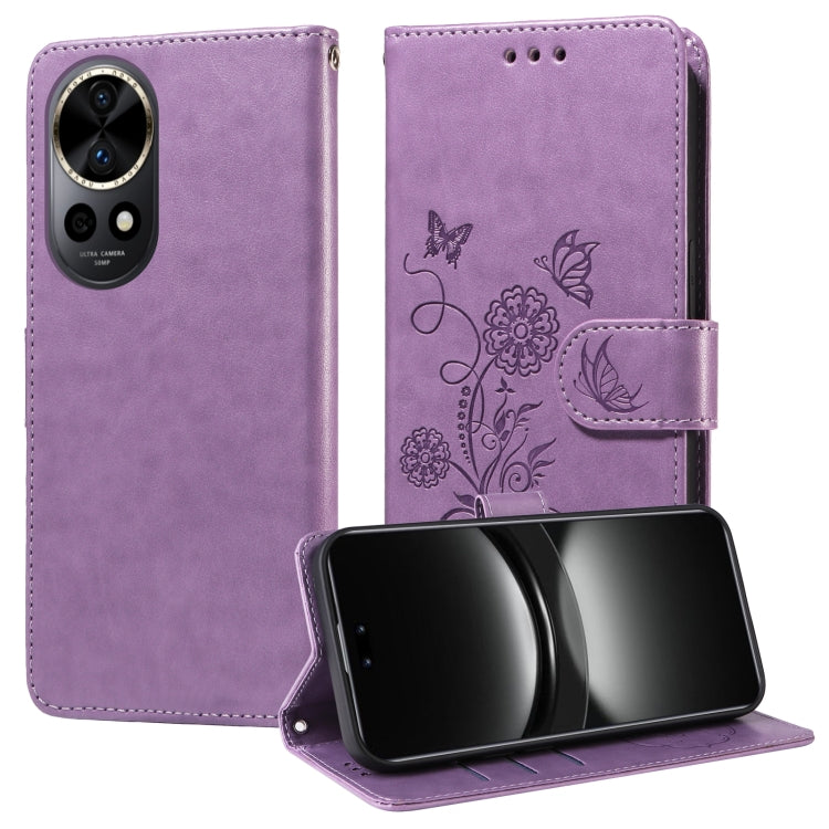 Funda de Cuero para Huawei Nova 12 con Diseño de Mariposas y Flores en Relieve (Morado)