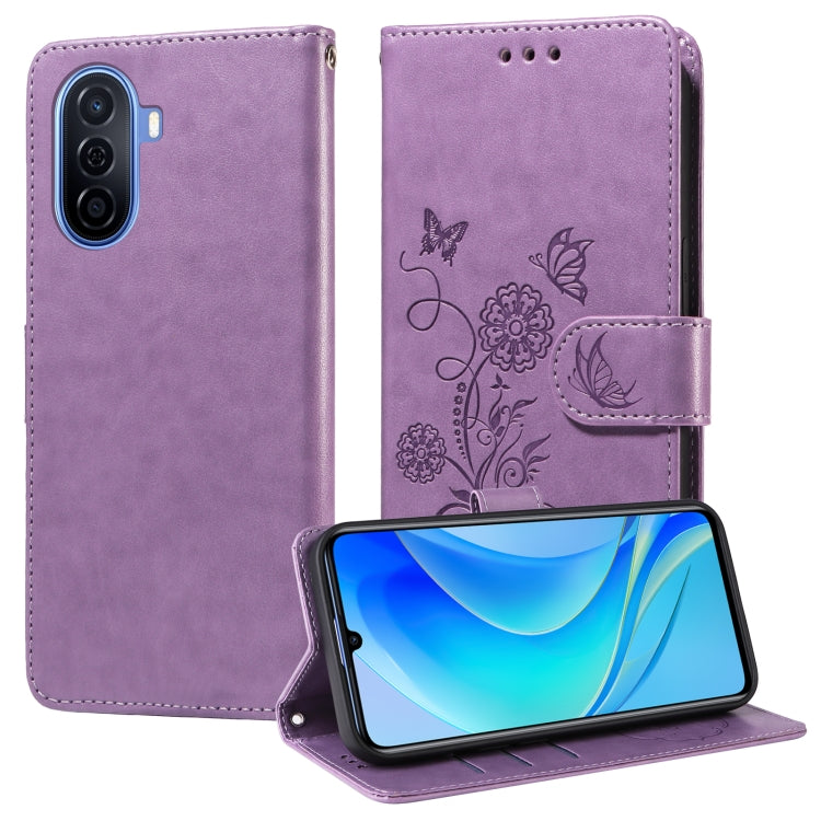 Funda de Cuero Huawei Nova Y70 Plus Diseño Mariposas y Flores En Relieve (Morado)