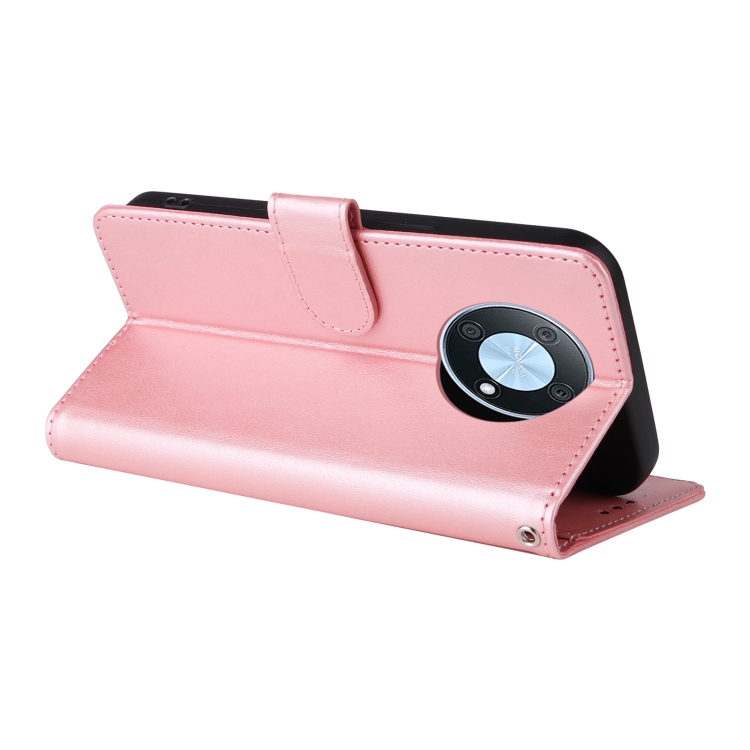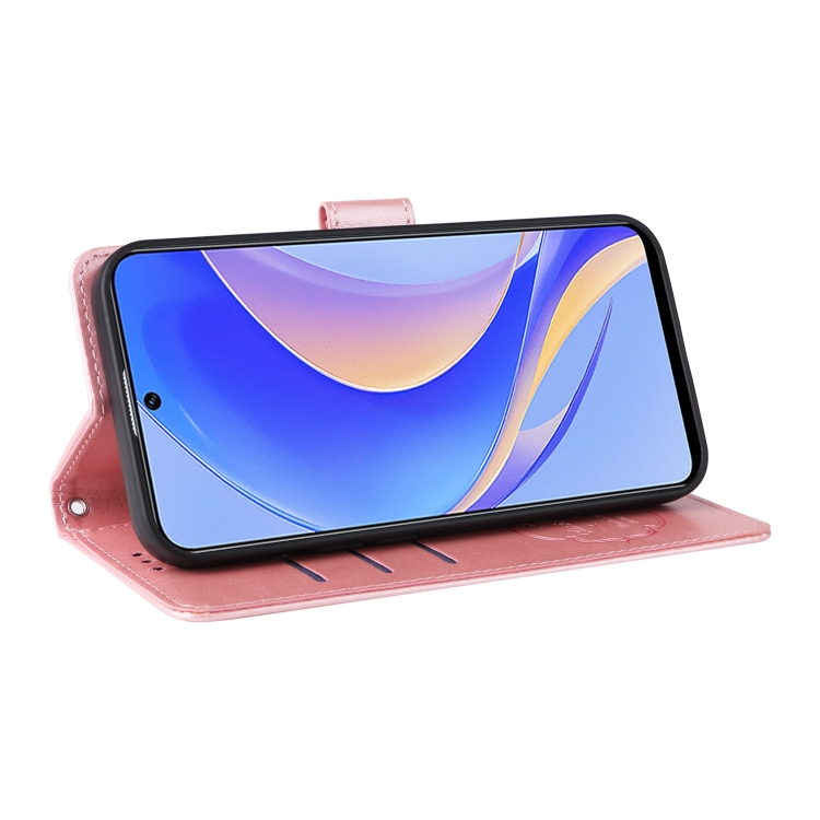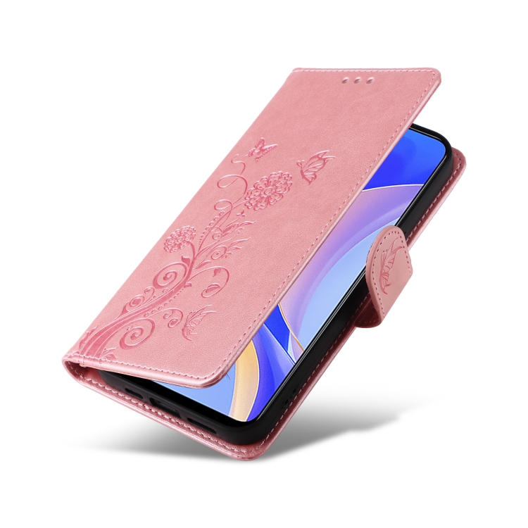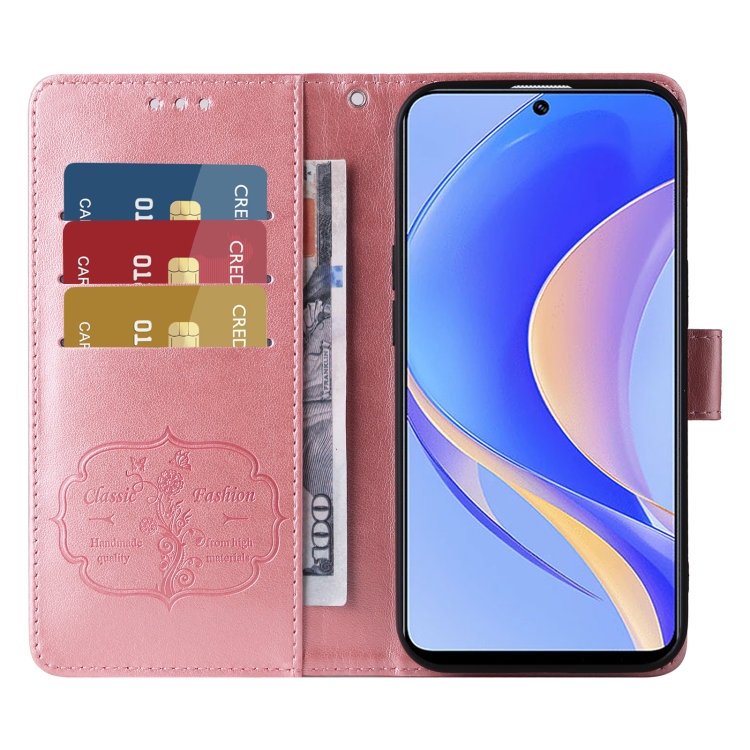Funda de Cuero Huawei Nova Y90 con Diseño de Mariposas y Flores en Relieve (Oro Rosa)