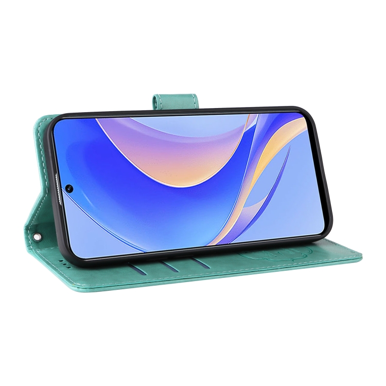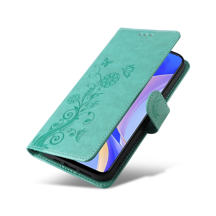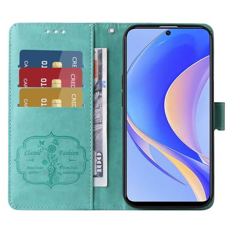 Funda de Cuero para Huawei Nova Y90 con Diseño de Mariposas y Flores en Relieve (Verde)