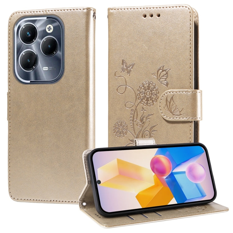Funda de Cuero para Infinix Hot 40 y Hot 40 Pro con Diseño de Mariposas y Flores en Relieve (Dorada)