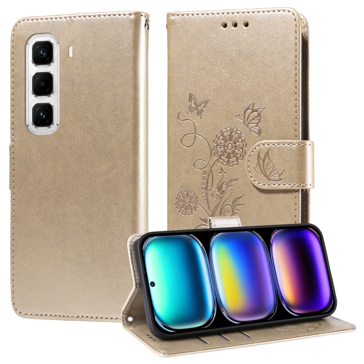 Funda de Cuero para Infinix Hot 50 Pro+ 4G con Diseño de Mariposas y Flores en Relieve (Dorada)