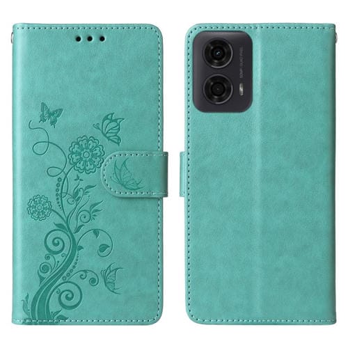Funda de Cuero Motorola Moto G04 G04S G24 E14 con Diseño Mariposas y Flores en Relieve (Verde)