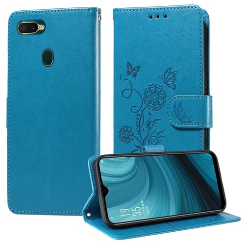 Funda de Cuero con Diseño de Mariposas y Flores En Relieve para Oppo A12/A12S/A11K (Azul)