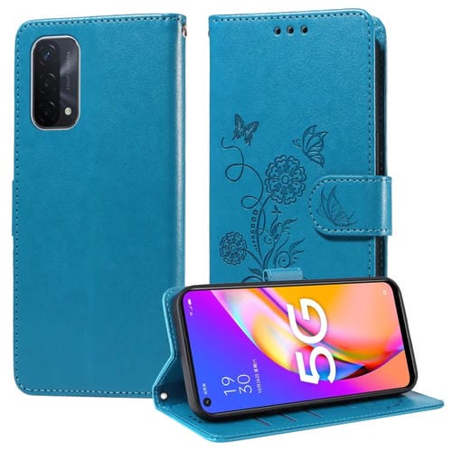 Funda de Cuero con Diseño de Mariposas y Flores En Relieve para Oppo A74 5G/A54 5G (Azul)