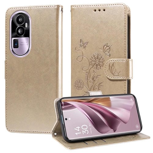 Funda de Cuero con Diseño de Mariposas y Flores En Relieve para Oppo Reno10 Pro+ (Dorada)