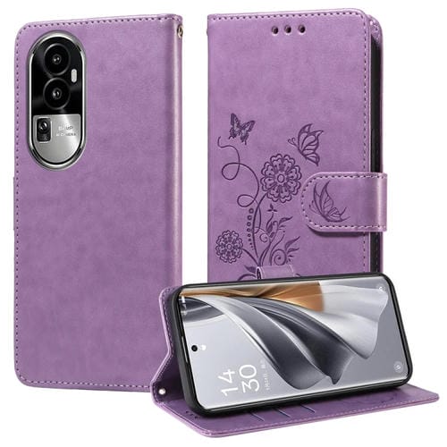 Funda de Cuero con Diseño de Mariposas y Flores En Relieve para Oppo Reno10/Reno10 Pro (Morado)