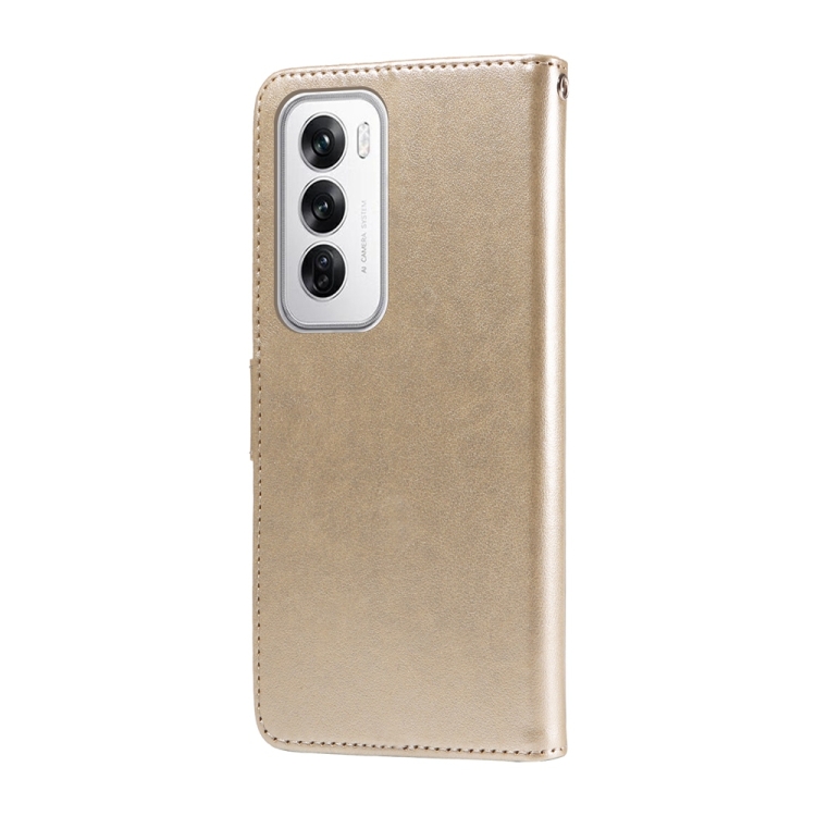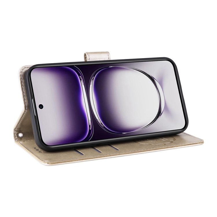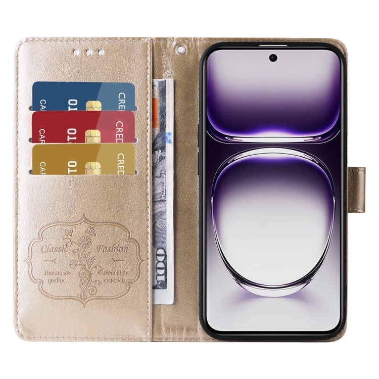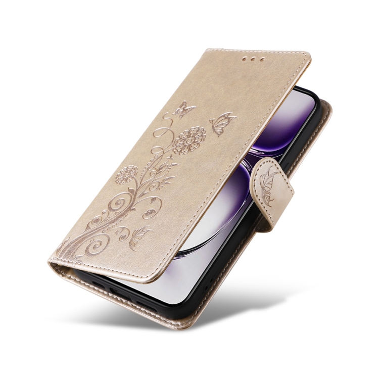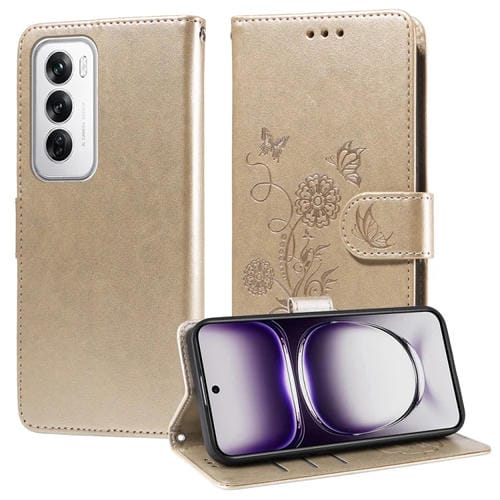Funda de Cuero con Diseño de Mariposas y Flores En Relieve para Oppo Reno12 5G (Dorada)
