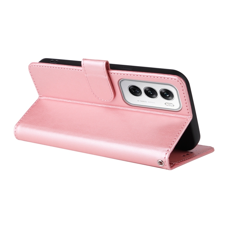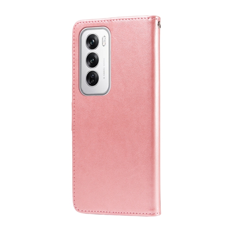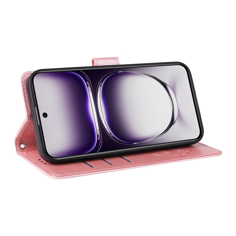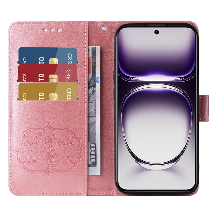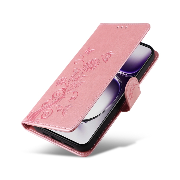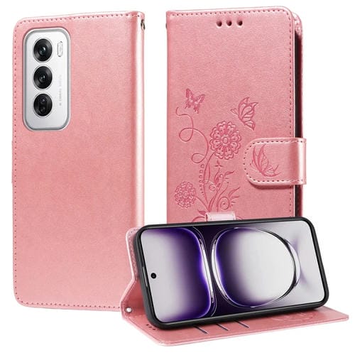 Funda de Cuero con Diseño de Mariposas y Flores En Relieve para Oppo Reno12 5G (Oro Rosa)