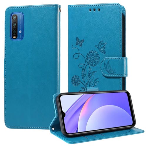 Funda de Cuero con Diseño de Mariposas y Flores En Relieve para Redmi Note 9 4G/10X 4G (Azul)