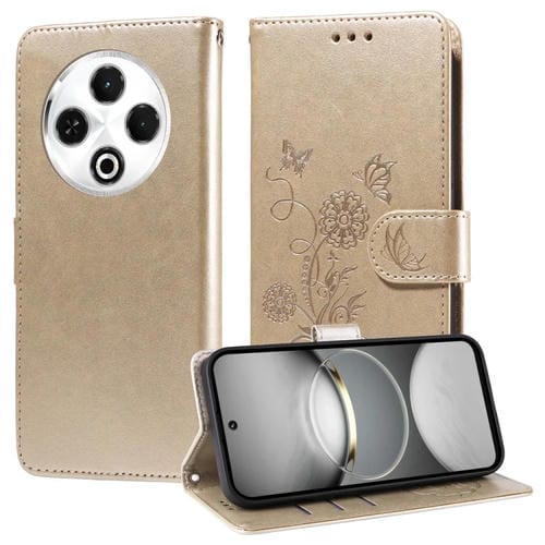 Funda de Cuero para Tecno Spark 30 4G con Diseño de Mariposas y Flores en Relieve (Dorada)