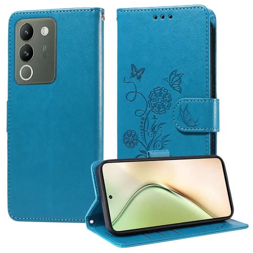 Funda de Cuero con Diseño de Mariposas y Flores En Relieve para Vivo Y200/V29E (Azul)