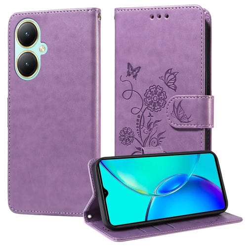 Funda de Cuero con Diseño de Mariposas y Flores En Relieve para Vivo Y35M+ / Y35+ / Y27 4G (Morado)
