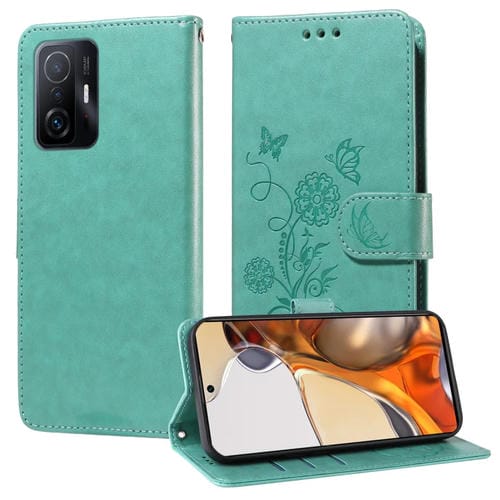 Funda de Cuero con Diseño de Mariposas y Flores En Relieve para Xiaomi Mi 11T/11T Pro (Verde)