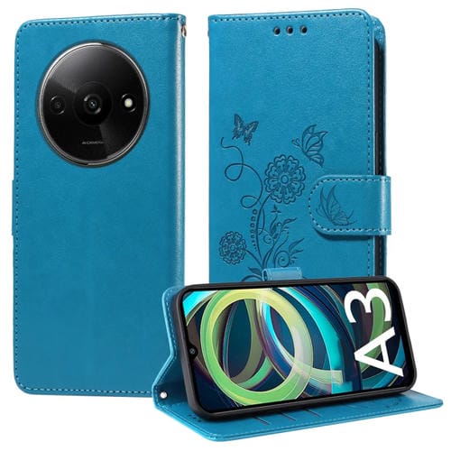 Funda de Cuero con Diseño de Mariposas y Flores En Relieve para Xiaomi Poco C61 4G/Redmi A3 4G (Azul)