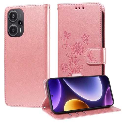 Funda de Cuero con Diseño de Mariposas y Flores En Relieve para Xiaomi Poco F5/Redmi Note 12 Turbo (Oro Rosa)