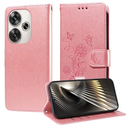 Funda de Cuero con Diseño de Mariposas y Flores En Relieve para Xiaomi Poco F6 (Oro Rosa)
