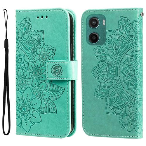 Funda de Cuero para Motorola Moto G05/E15 con Estampado de Flores de Siete Pétalos (Verde)