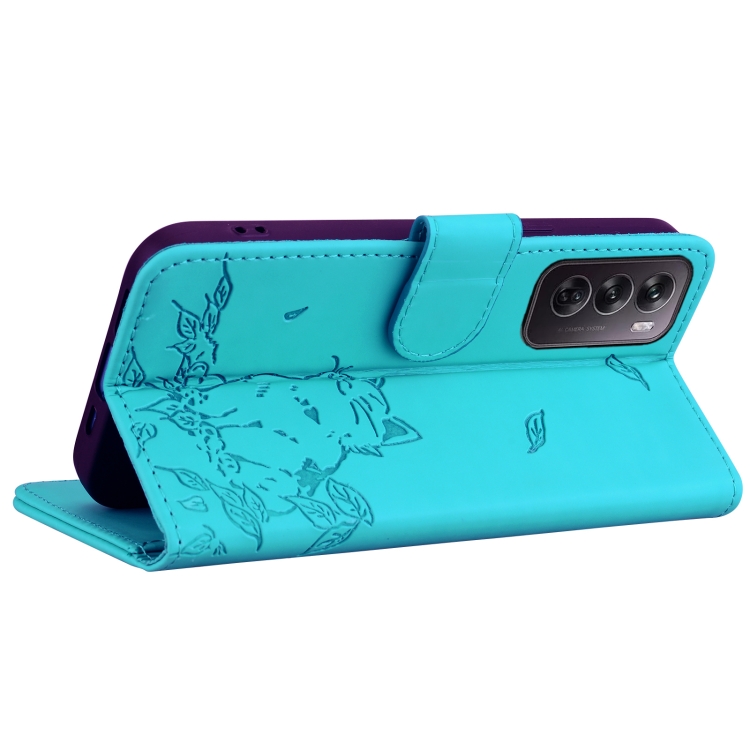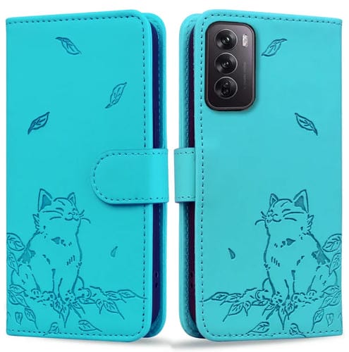 Funda de Cuero con Estampado de Gato Lindo para Oppo Reno12 5G Global (Azul Lago)