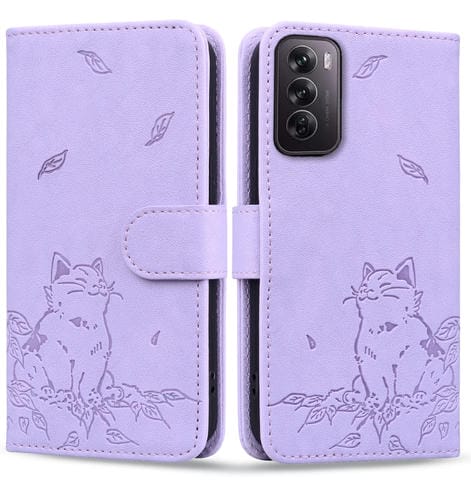 Funda de Cuero con Estampado de Gato Lindo para Oppo Reno12 Pro 5G Global (Morado)