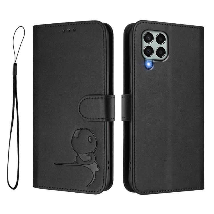 Funda de cuero con estampado de panda y RFID para Samsung Galaxy M33 5G con cordón (negra)