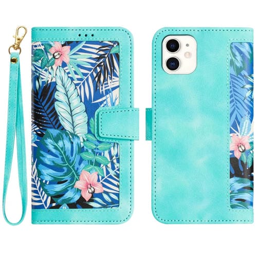 Funda de Cuero para iPhone 12 Mini con Estampado Floral y Cordón (Verde)
