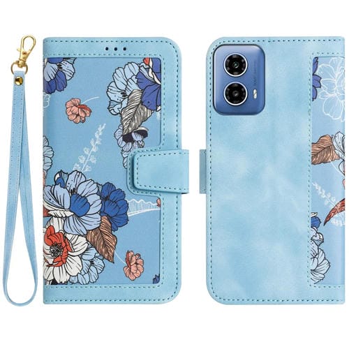 Funda de Cuero con Estampado Floral para Motorola Moto G 5G (2024) con Cordón (Azul Claro)
