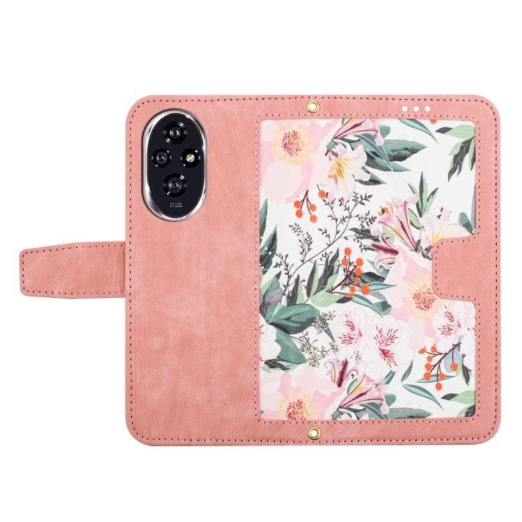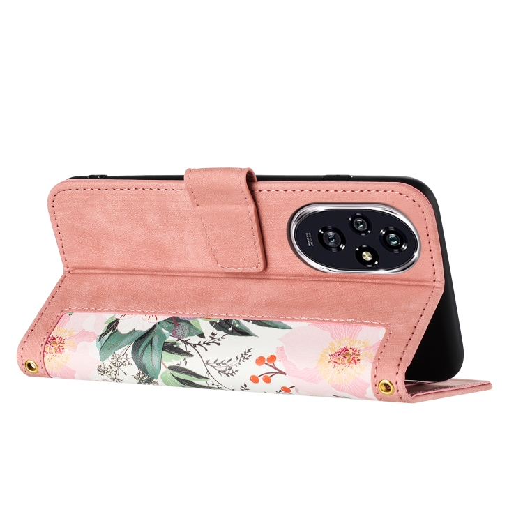 Funda de Cuero Honor 200 Pro con Estampado Floral y Cordón (Rosa)