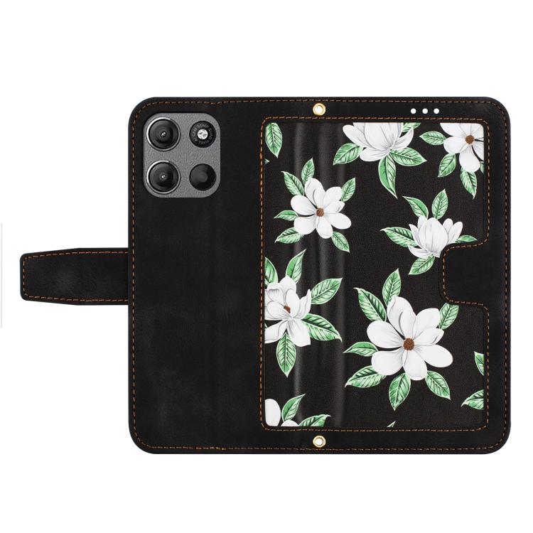 Funda de Cuero con Estampado Floral y Cordón para Motorola Moto G 5G (2025) (Negro)