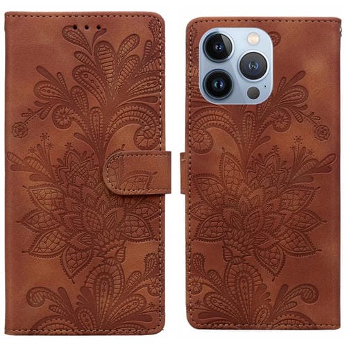 Funda de Cuero para iPhone 13 Pro con Hebilla Magnética y Diseño Floral en Relieve (Marrón)