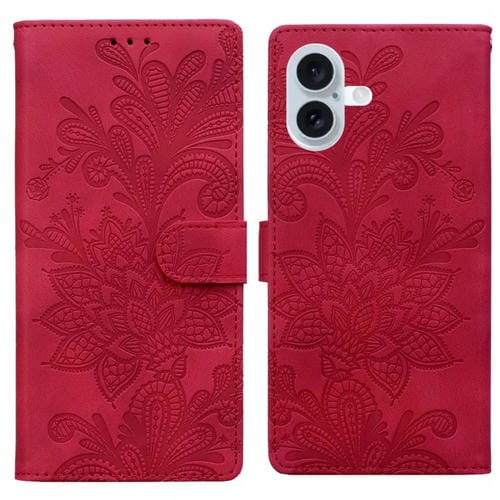 Funda de Cuero con Hebilla Magnética y Diseño Floral En Relieve para iPhone 16 Plus (Rojo)
