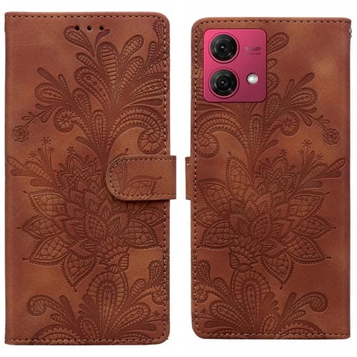 Funda de Cuero Motorola Moto G84 con Hebilla Magnética y Diseño Floral en Relieve (Marrón)
