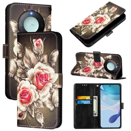 Funda de Cuero Honor X9C 5G con Patrón de Dibujo de Colores (Rosas Sobre Negro)
