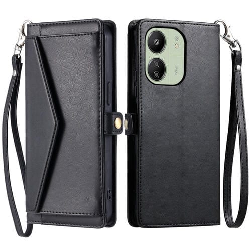 Funda de Cuero con Ranura para Múltiples Tarjetas y Cordón para Redmi 13C 4G/5G (Negro)