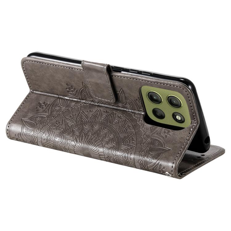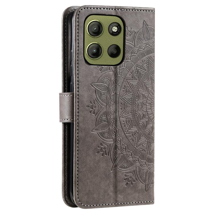 Funda de Cuero con Relieve de Flores para Motorola Moto G15 con Cordón (Gris)