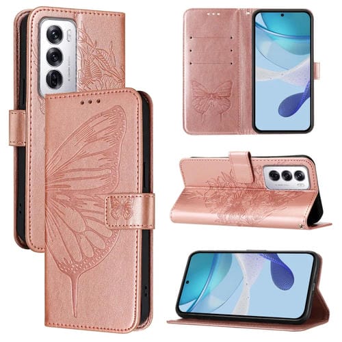 Funda de Cuero con Relieve de Mariposa para Teléfono Oppo Reno12 5G (Oro Rosa)