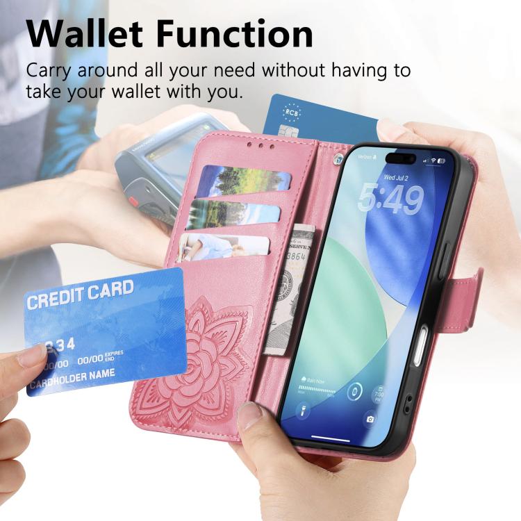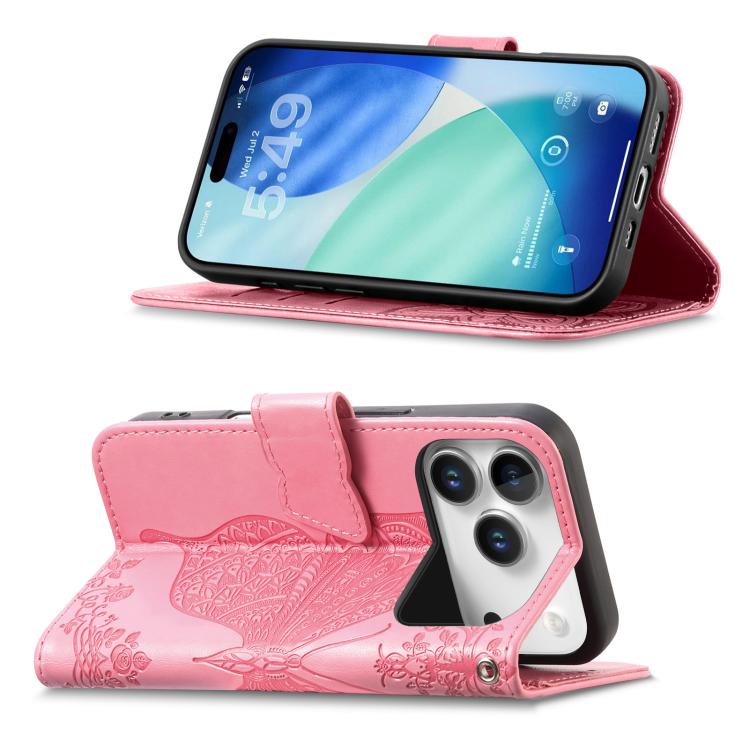 Funda de cuero con relieve de mariposa y flor para iPhone 17 Pro Max (rosa)
