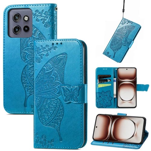 Funda de Cuero con Relieve Mariposa y Flor para Motorola Edge 50 Neo (Azul)