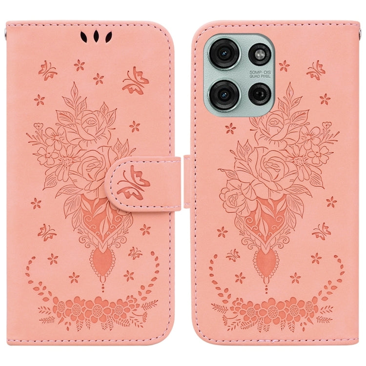 Funda de Cuero con Relieve Mariposa y Rosa para Motorola Moto G75 5G (Rosa)