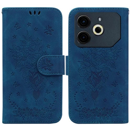 Funda de Cuero con Relieve Mariposa y Rosa para Tecno Pova 6 Neo (Azul)