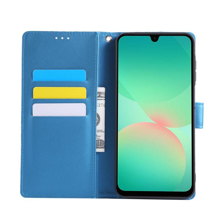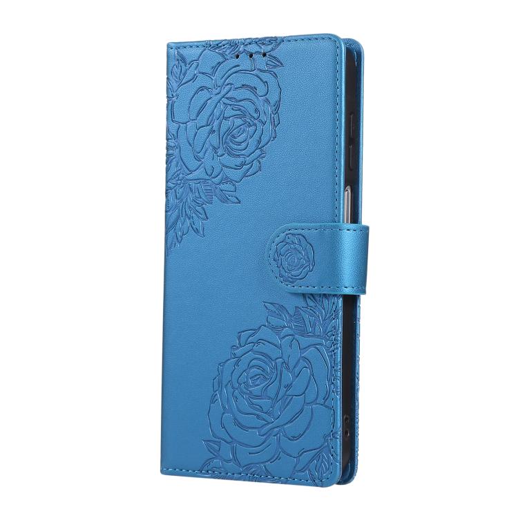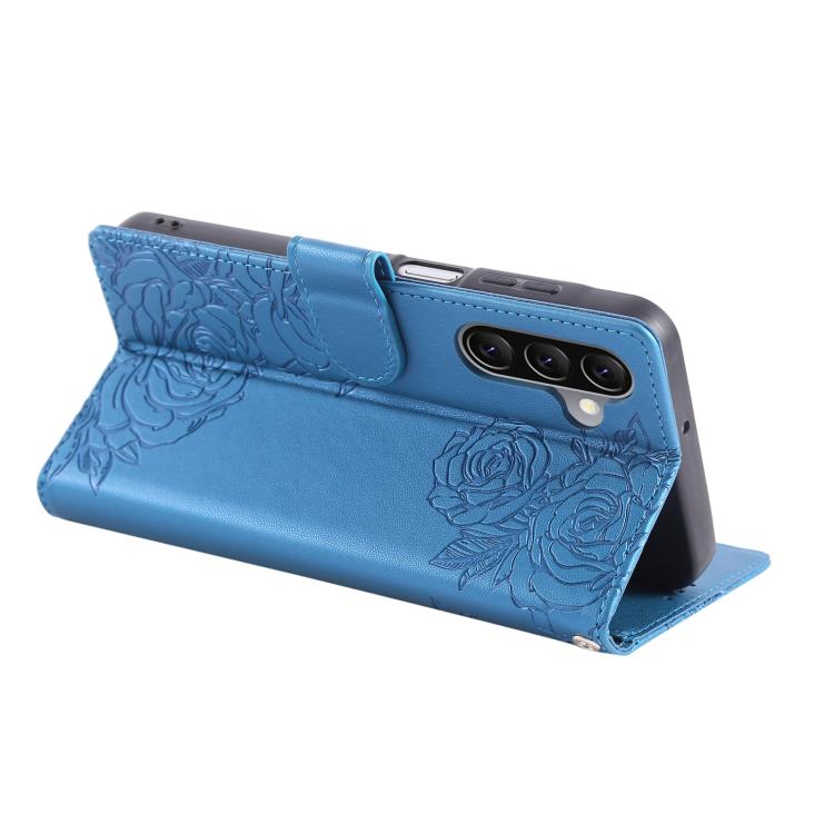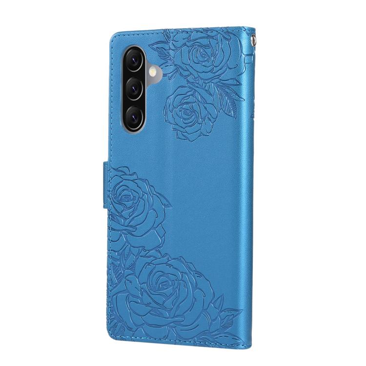 Funda de cuero con relieve de rosa para Samsung Galaxy A17 5G, con 3 ranuras para tarjetas (azul)
